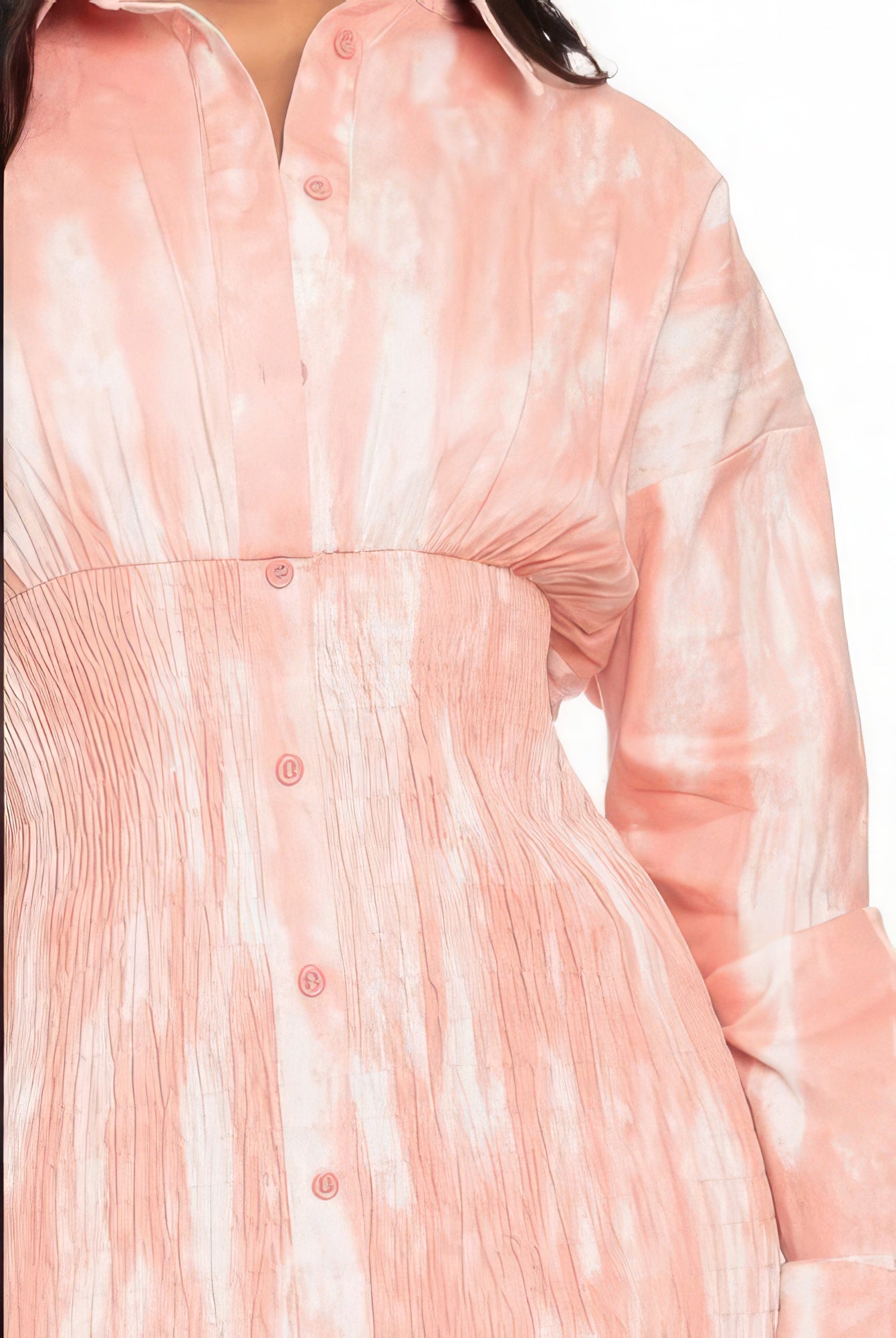 Step into the world of trendy fashion with our Tie Dye Mini Dress, featuring a stretchable denim material, ruched details, and front buttons for a unique and stylish look.