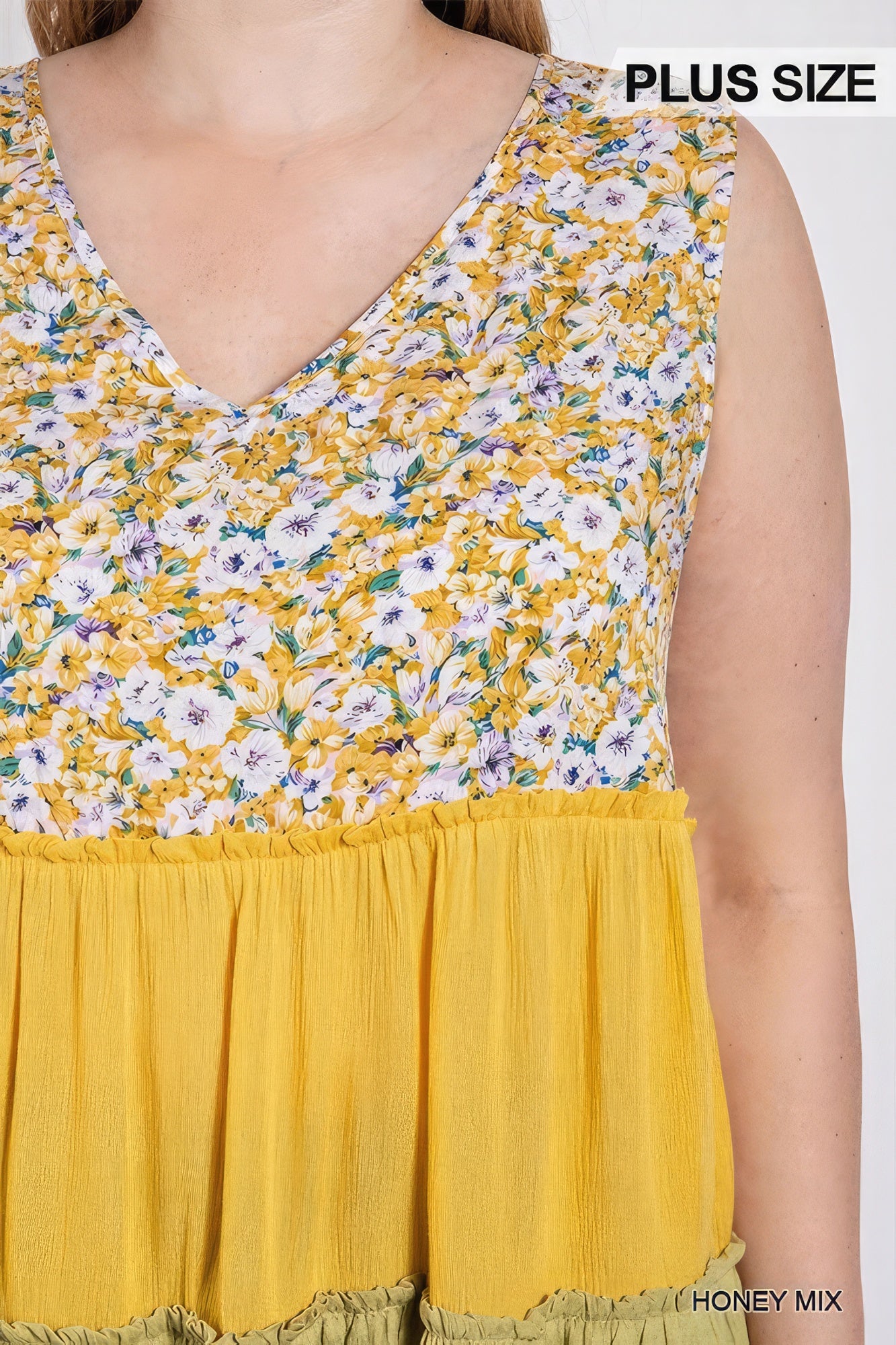 Get ready to turn heads and make a statement with our Floral Color Block Ruffle Detail Tiered V-Neck Top in Honey Mix. Add it to your cart now and experience the perfect blend of fashion and comfort!
