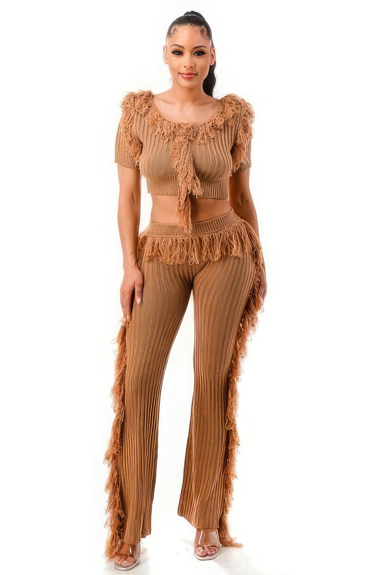 Experience the perfect fusion of fashion and comfort with our set. The cable knit pants, short sleeve fringe crop top, and fringe pants create a stylish and coordinated look that sets you apart.