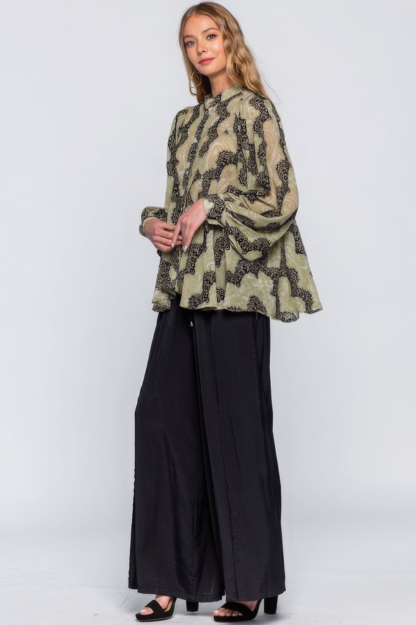 4. Design: Adorned with intricate lace detailing and bishop sleeves, this shirt exudes sophistication and femininity. The see-through fabric adds an element of allure to your look.